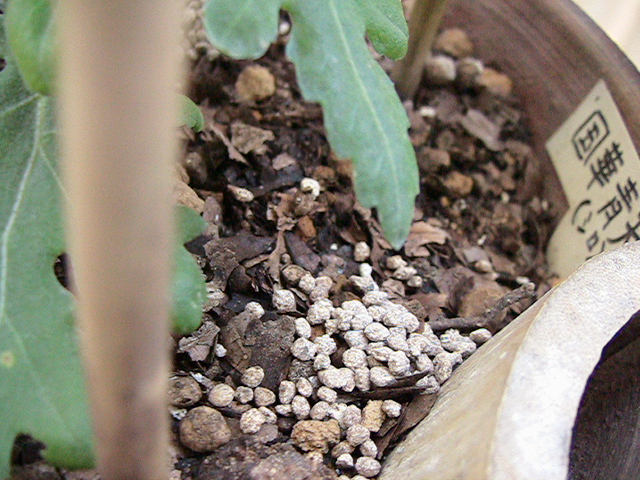大鉢に鉢上げしたときの培養土は、池土が入手困難なために赤玉土だけを混ぜ、「鉄力あぐり」も少なめだったせいでしょうか、近頃葉っぱの育ちが今ひとつのように感じます。