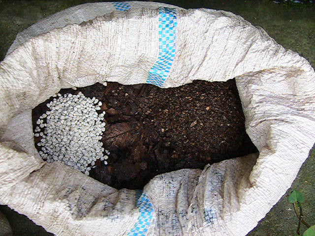 けっきょく、培養土(10ℓ~土嚢袋入り)にリンカリ肥料(1握り)と再生土中粒(2ℓ)を混ぜて、増し土にしました。