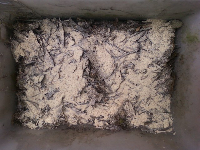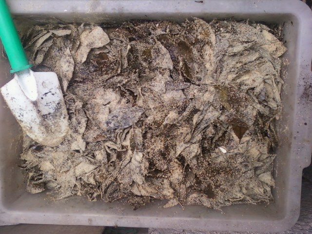 枯葉をプラスチック製の桶(30ℓ)に入れて、水に漬け、ブロック(半分)を置いて重しをしました。