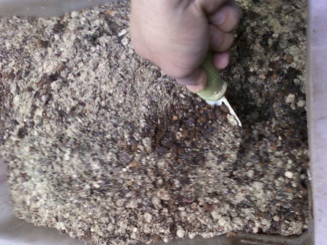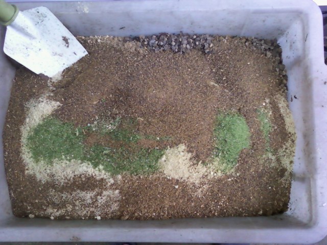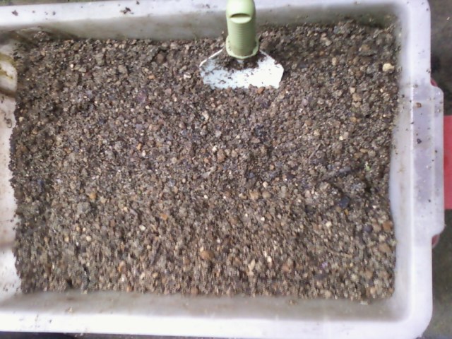 4月5日に、去年使った培養土を、5㎜の篩(ふるい)でふるい分けした、大粒の方を、下記の材料を混ぜて、発酵させ「再生土」を作ります。
