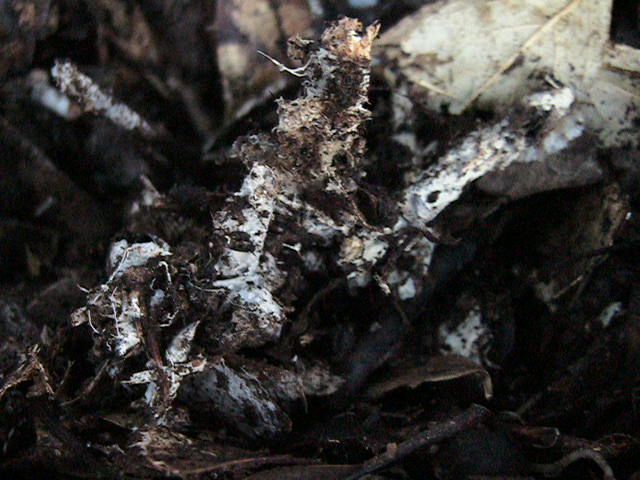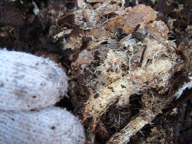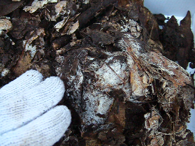 土着菌の菌糸のかたまりの付着した土をふるい(篩)にかけました。