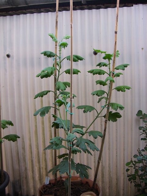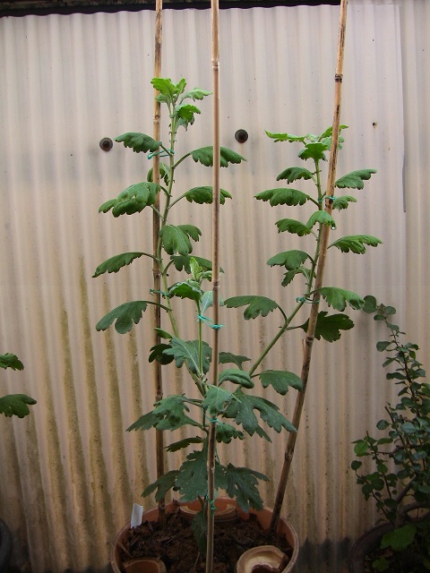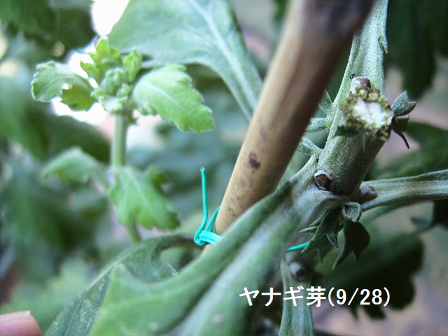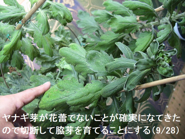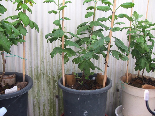 その目的・意味合いは、8月の末~9月の花芽分化期に紛らわしい花芽モドキができると正規の花が咲かないので、生育が強すぎると早く柳芽が発生する。そこで、短日植物の菊が正規の花芽分化のために日照時間を感知出来る様に、ピンチと胴切りで生育を少し弱める作業です。ピンチは芽先をつみ取る事で、胴切りはかなり下で充実した 幹を切ることです。