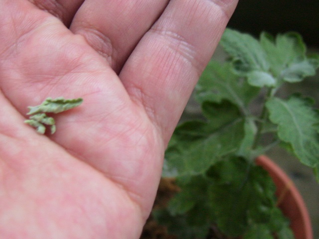 ひと月ほど前から、葉っぱが15枚ほどになった時点で摘心をし、徐々に脇芽がでてきた苗↓。
