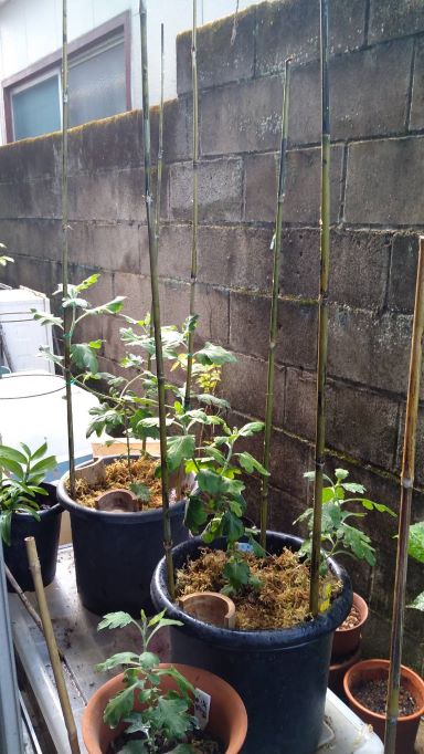 三方へ枝が伸びてきた順に、支柱へ誘引。