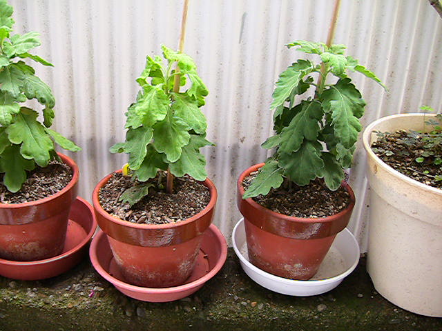 一鉢は、育つ途中(10月)で猫がぶつかって葉っぱが半分ほどなくなった後、育ちはしますが蕾をつけないようです。(写真右端の、苗は左から2番目)