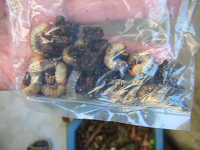 成長の悪い苗の原因は、コガネムシの幼虫が、9月に2匹、10月末に「オルトラン」を撒くとまた1匹出てきました。