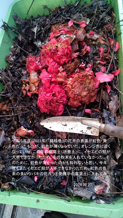 前年「錦絵巻」色が薄かったので、椿の花ガラを拾ってきて、合計140個投入。