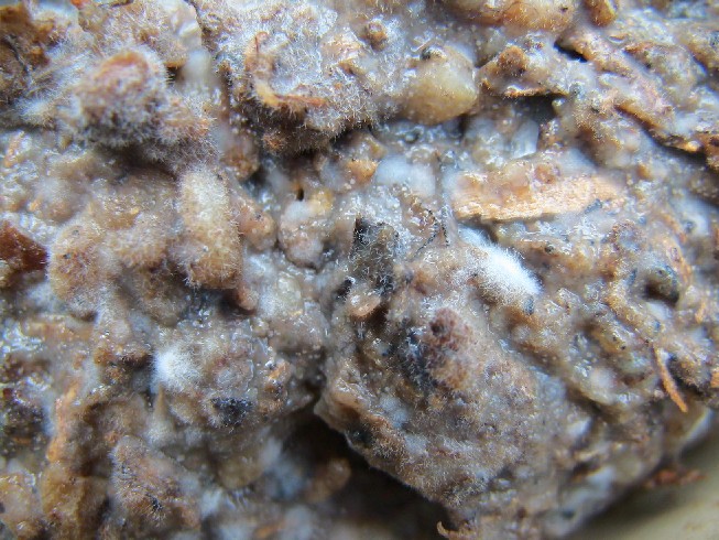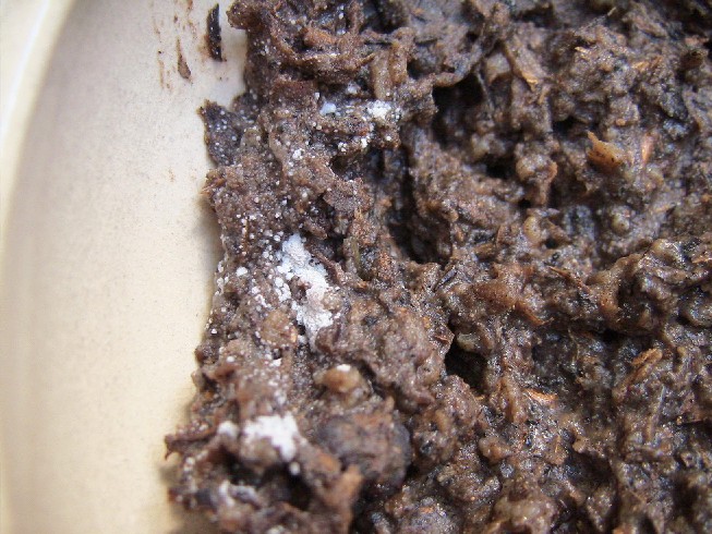 土着菌培養-Bの方のミニ土鍋で、土着菌が菌糸を伸ばしはじめました。