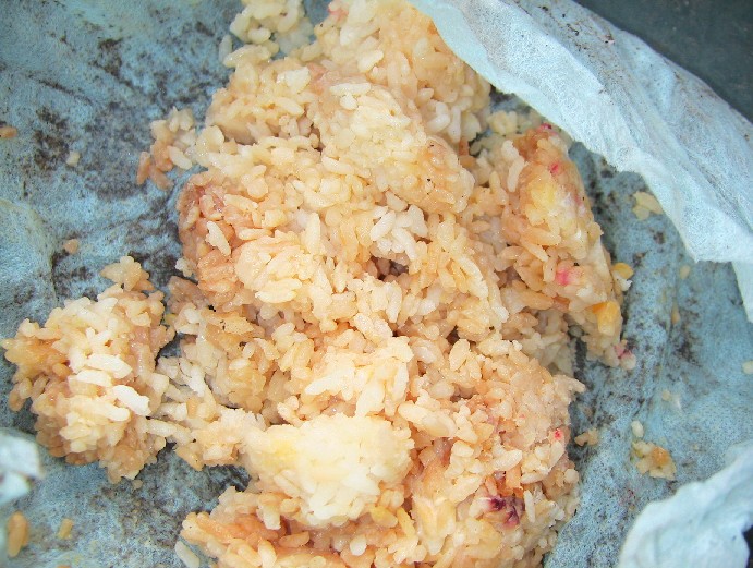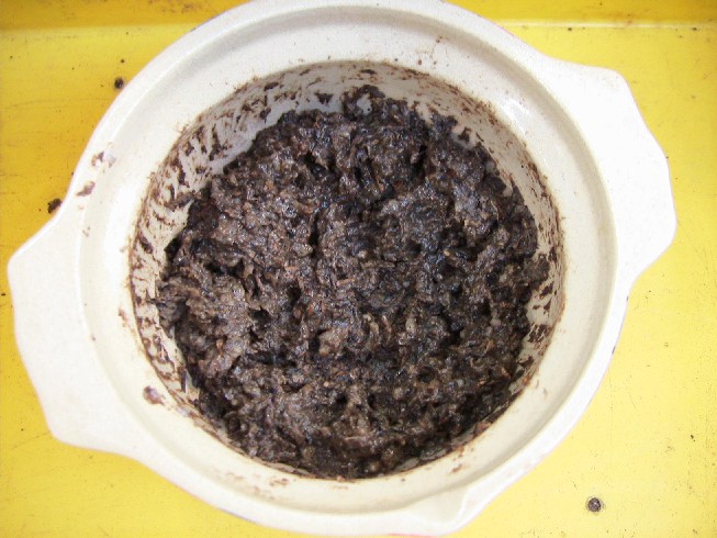 土着菌は飯粒全体に満遍なく繁殖したようなので、黒砂糖を100グラム(ご飯の3分の1)を混ぜてみました。