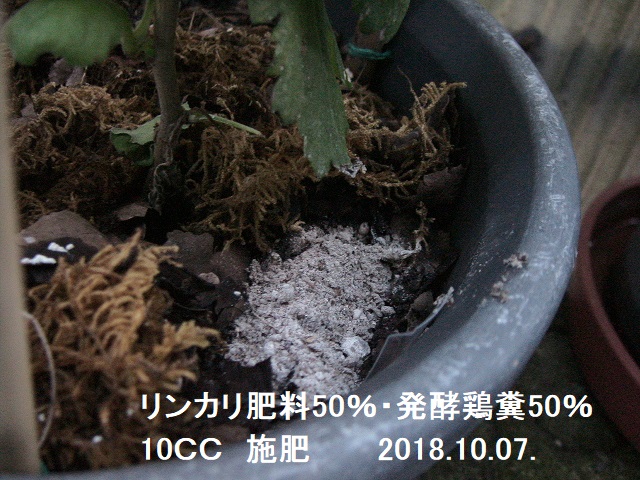 しかし、今年栽培方法といいますか施肥のことについて特に変えていたことは、6月の定植(8~9号鉢への鉢上げ)の時に発酵油粕の親指大の1~2cmの大きさの発酵油粕を3個ほど入れていたことです。