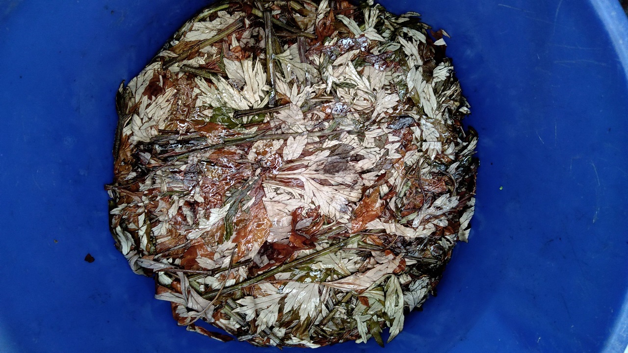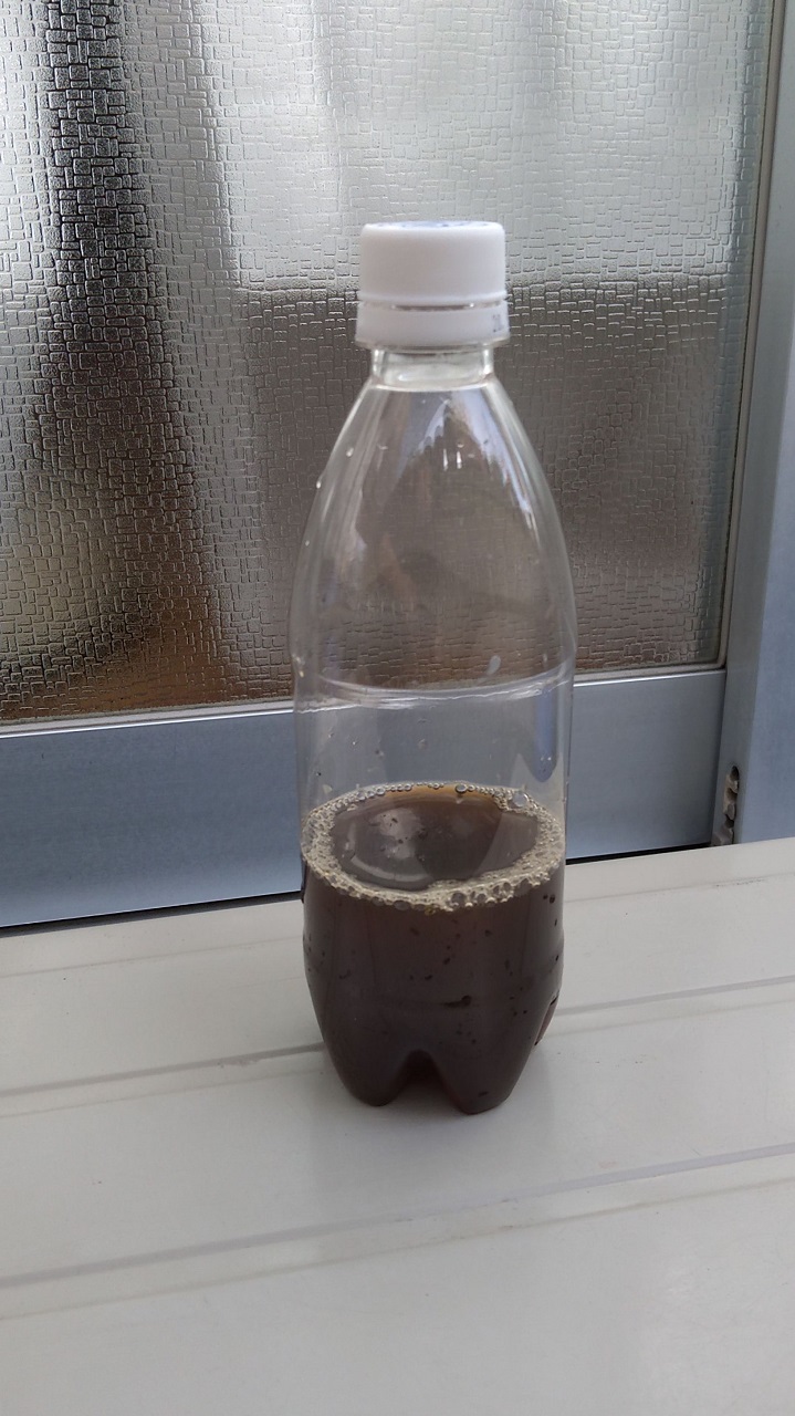 腐葉土が十分発酵していないと、鉢に苗を植えてから、鉢の中が途中で酸素不足になるとのことでした(NHK「趣味の園芸」での解説)。そのため、8~9号鉢に定植をするのはまだ先なので、今のうちに天恵緑汁を作り、これで十分な発酵を促そうとするものです。
