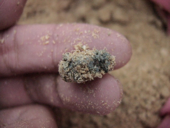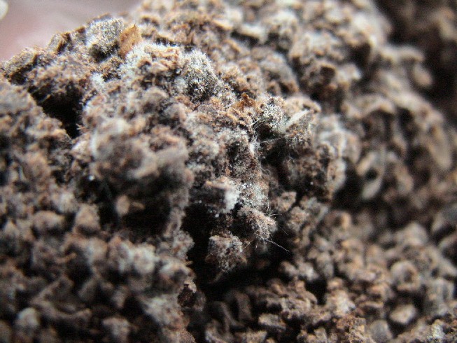 写真③④ともに 2月14日のようすです。指先に乗るほどの塊の中には灰色のカビのようなものがありました。何かの土着菌でしょうか…!?