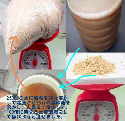 ※2月2日仕込み分…250CCのお湯に25gの黒砂糖を溶かし、人肌まで冷まして、100倍に薄まる土着菌液にして糠1000gと混ぜました。これには澱粉を入れない方法で仕込みました。さらに、土着菌培養液を薄めた液で発酵させたコーヒー豆殻をひとにぎりほど入れまいた。