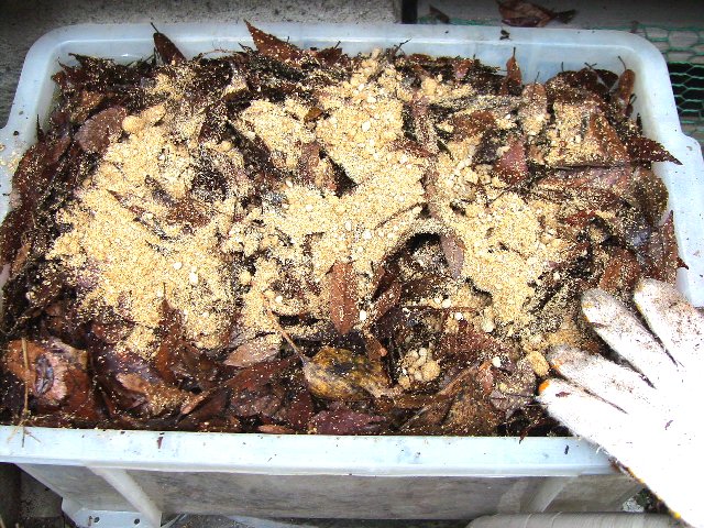 ▼1/19 拾ってきた落ち葉(家庭用ゴミ出し用袋大一杯)を一晩水に漬け、土着菌発酵米糠(1kgほど)と油粕(50gほど)少々を混ぜながら仕込みました。