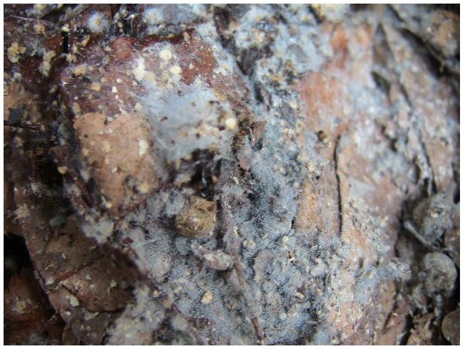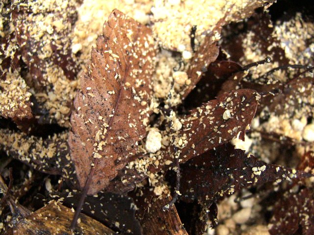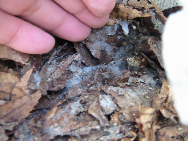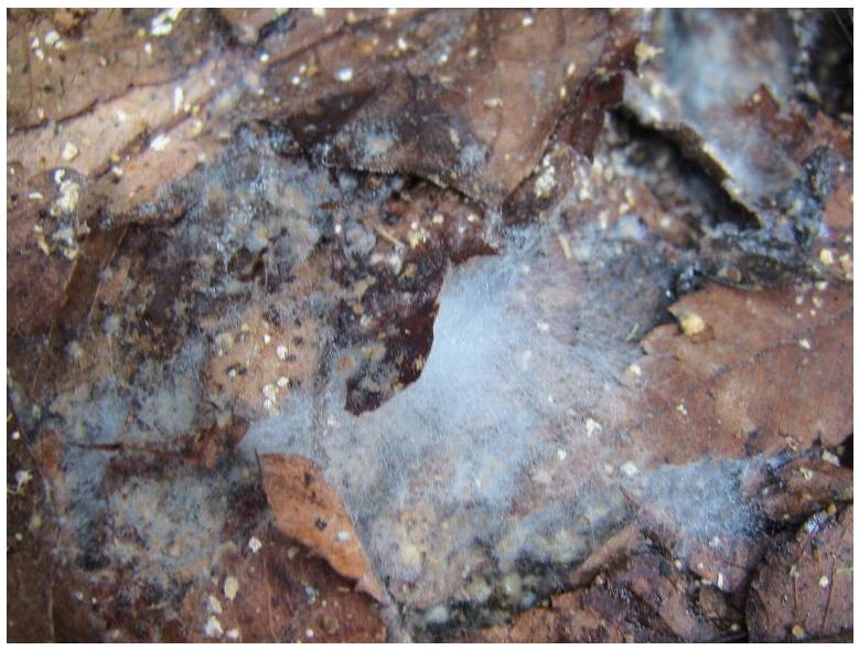 土嚢袋の口を開けて見ると、表面は乾燥したようで葉っぱの枯れ具合は変わりません。しかし、少し表面の葉っぱを掘ってみると、菌糸がよくはびこっています。土着菌が枯れ葉を発酵させてくれているのでしょう…(多分!?)。