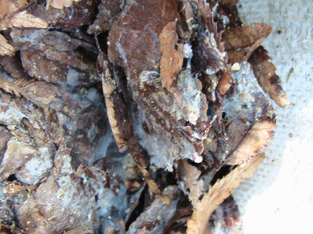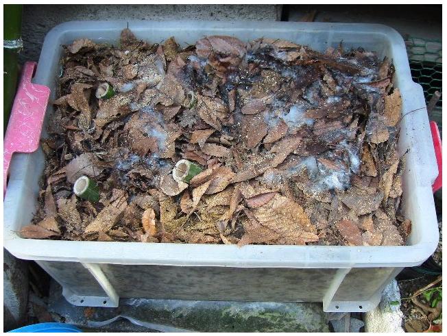 ▼1/27 仕込んで1週間が過ぎたので見てみました。表面には白い菌糸のようなもので覆われており(写真中)、少し中のほうは灰色の菌糸に近い粉状のもので覆われており(写真右)、通気性の悪かった底の方は葉っぱも糠も色が変わっていませんでした。左の写真の竹は中の方の通気のため入れました。効果はありました。