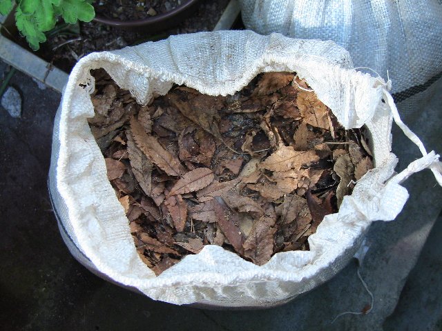 ◆この後、4月まで熟成させていますと、乾燥気味だったので時々水をかけ湿らせていたのですが、腐葉土は土嚢袋で熟成させると乾燥気味になり、袋に接している外側の熟成が進みません。空気が網目をあまりにも通り過ぎるからでしょう。腐葉土は土嚢袋で熟成させない方が良いようです。もう少し通気性の良くないものが良いようです。