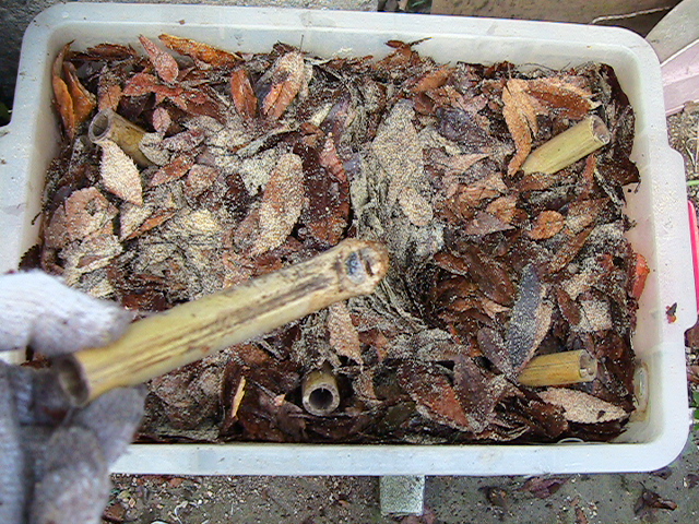 下の写真のように、切り口を斜めにした竹の棒を差し込んで、空気が内部まで行きわたるようにします。こんな少量の腐葉土仕込みには必要ないかもしれませんが念のために。
