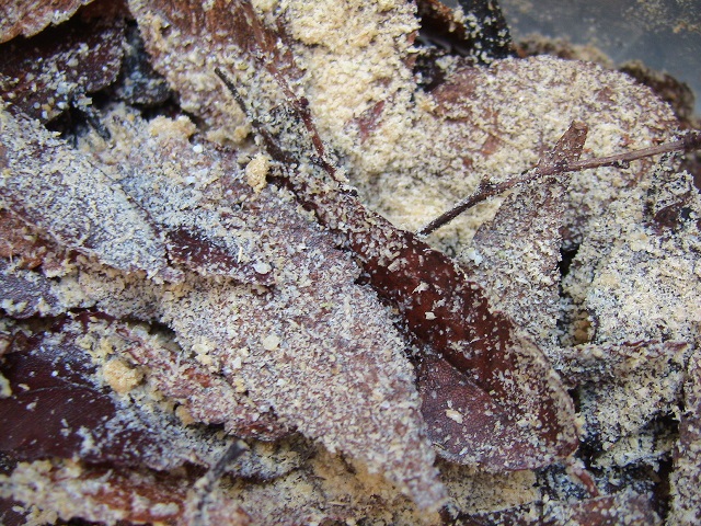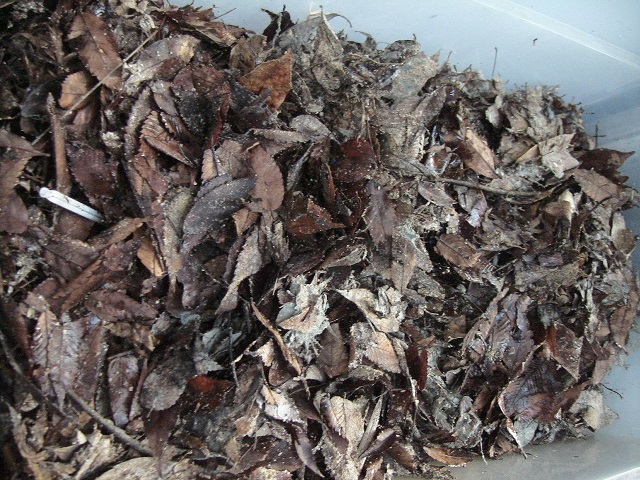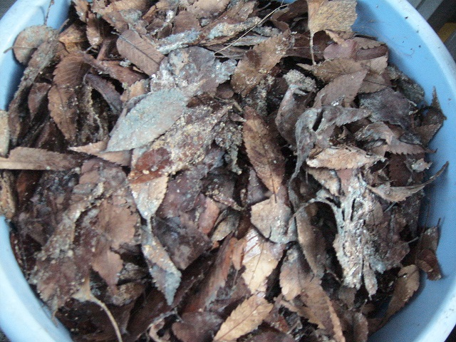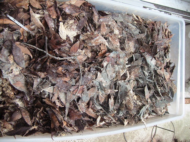 そのため、2つのプラスチックケース両方とも、底の方にある湿り気味の葉っぱを上部に出してよく空気が入るようほぐして、さらに発酵が進んだ部分と混ぜこぜにしてみました。いわゆる切り返しを入念にしてみました。